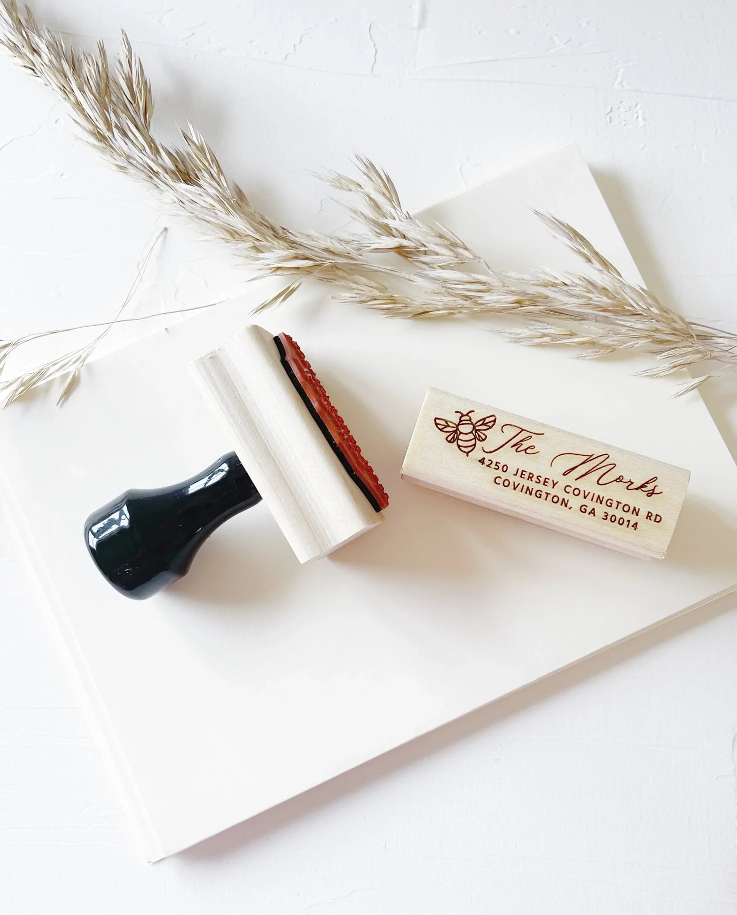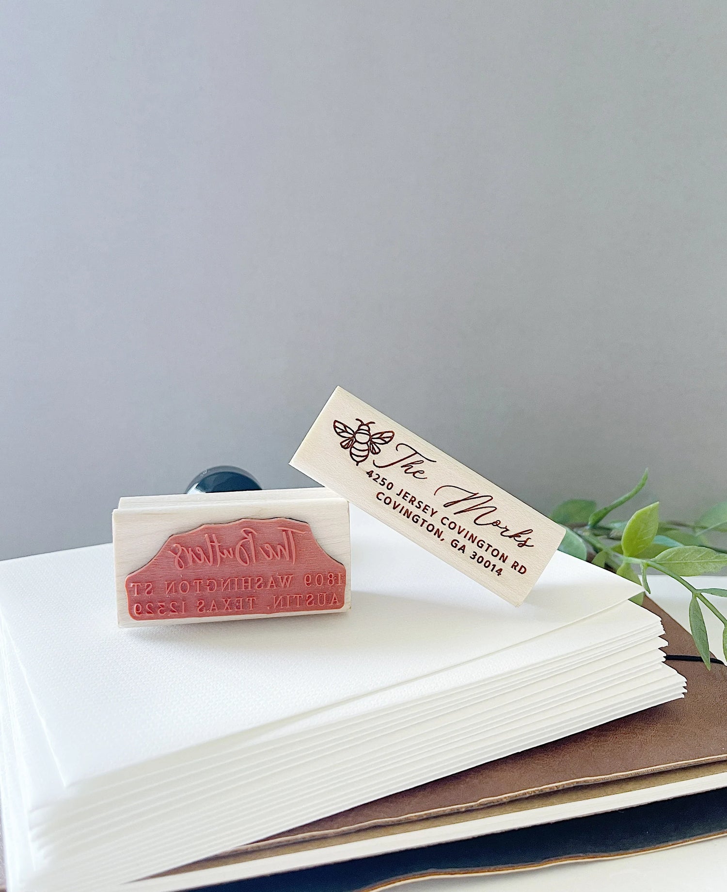 Adorn your envelopes in style with our personalized Return Address Stamps.Made in house using precise laser engraving with high quality rubber. Your stamp is then finished by hand on either a custom cut solid wooden block or a self-inking cartridge. Please note that not all stamp designs come in the self-inking option due to size constraints.Wooden Stamps• Mounted on solid wood with an optional handle.