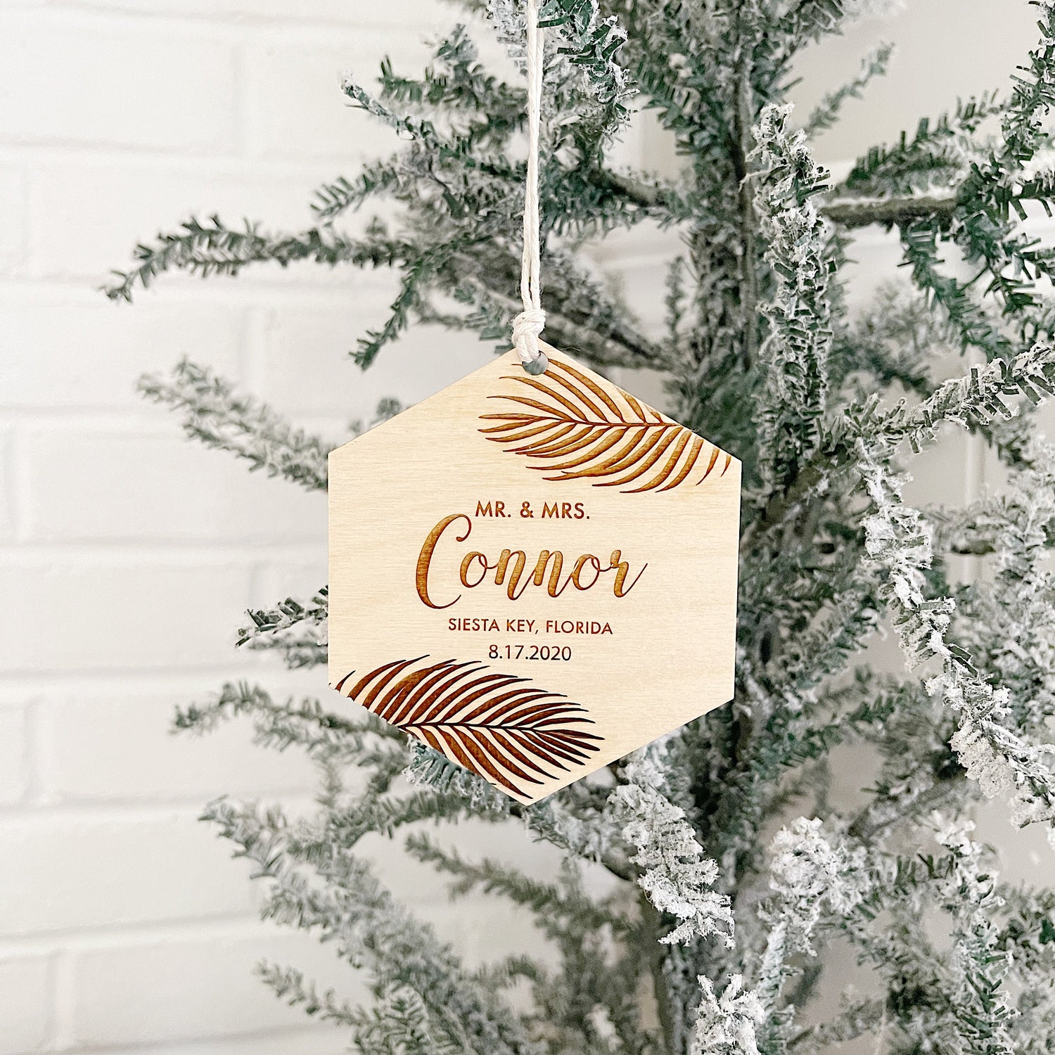 Tropical wedding themes Christmas ornament personalized to the couple's details.