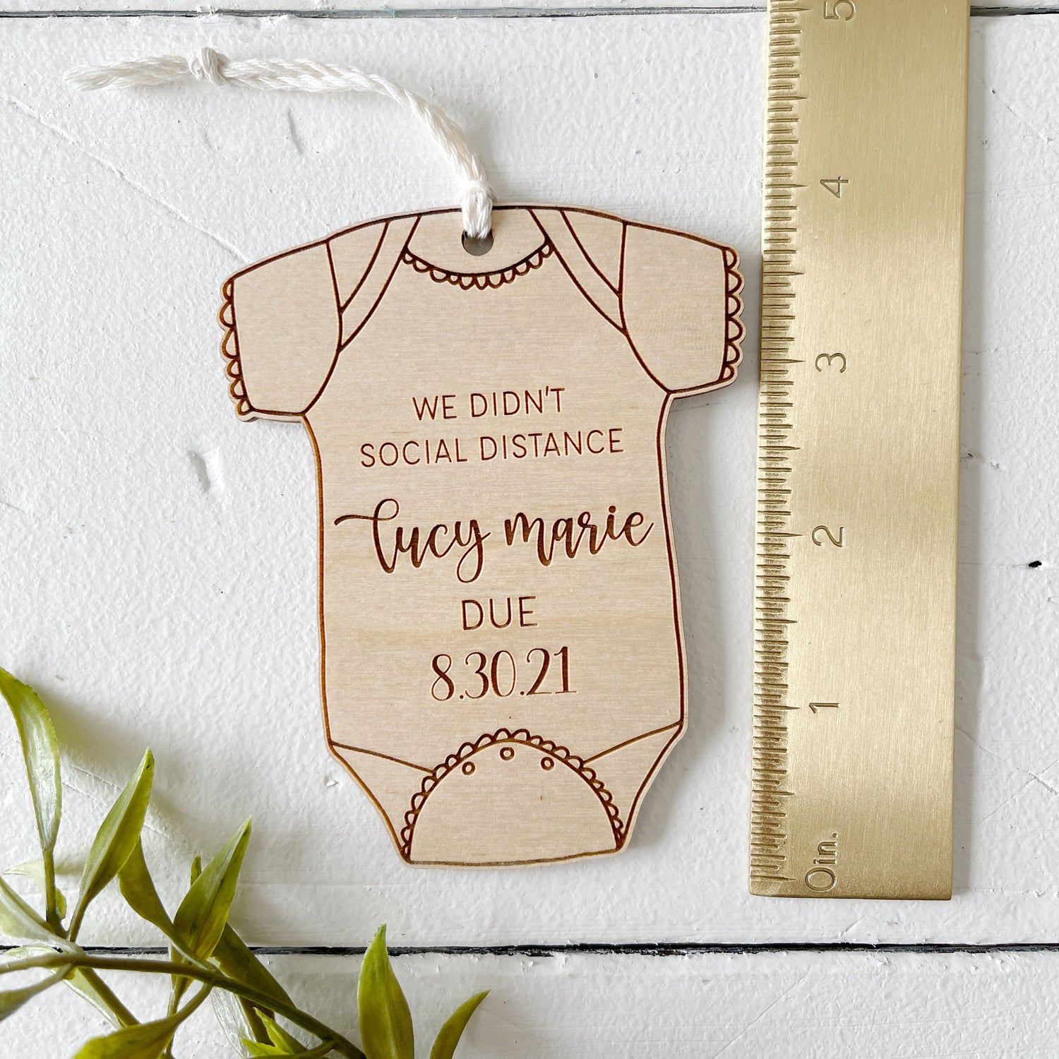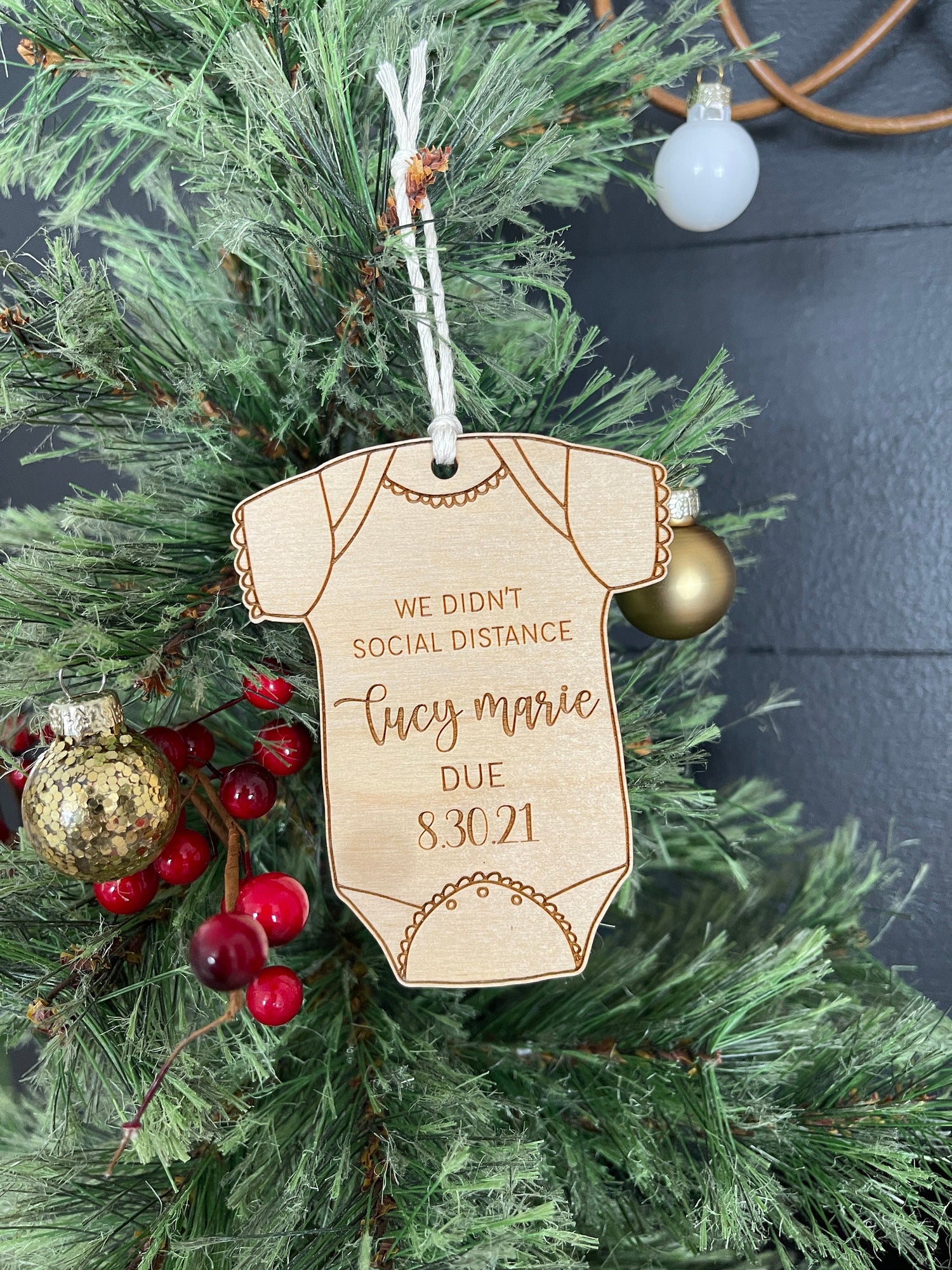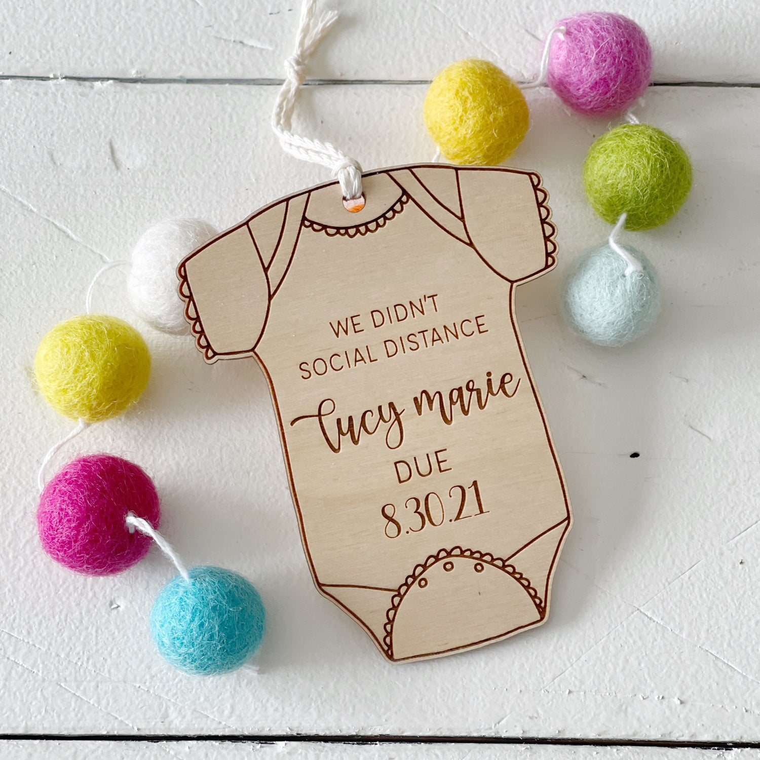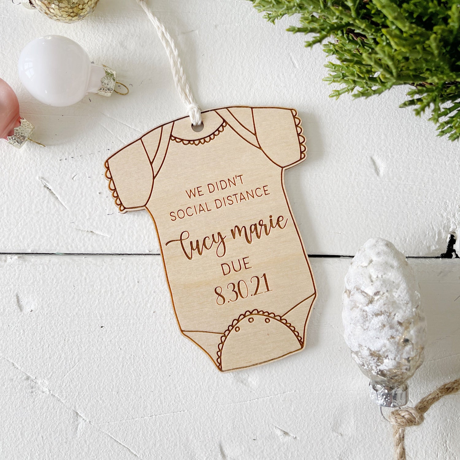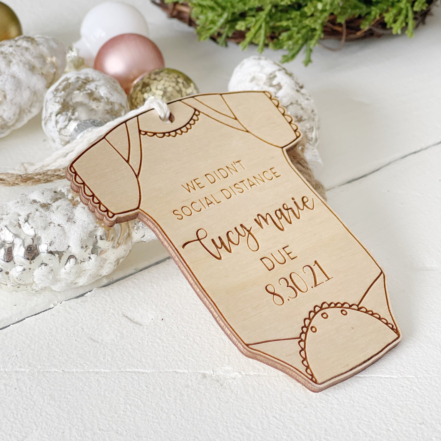 Celebrate your miracle with this customized wooden engraved baby announcement ornament.