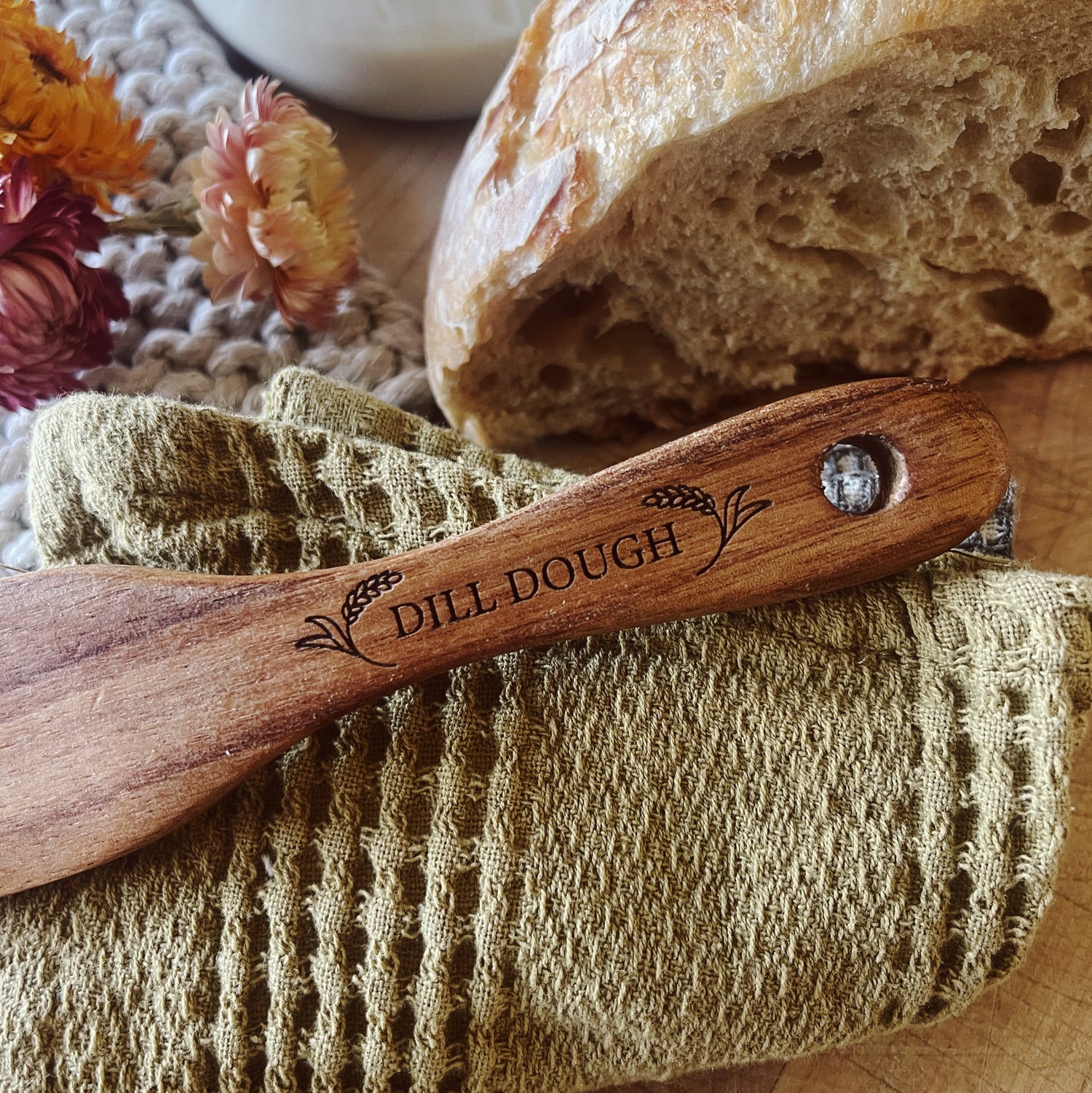 This spurtle is personalized with your own sourdough starter's name, or any name you wish, and a cute wheat design.
