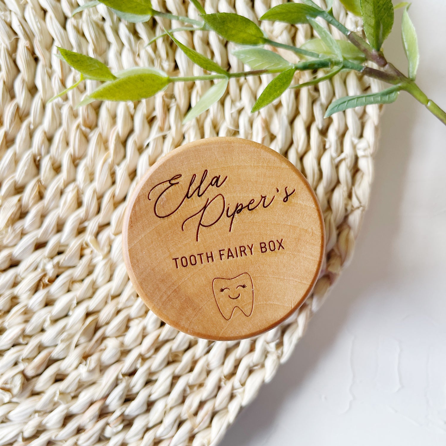 A round solid wooden keepsake box to hold those precious baby teeth for the Tooth Fairy. Custom engraved with your child's name making this the perfect little keepsake gift.